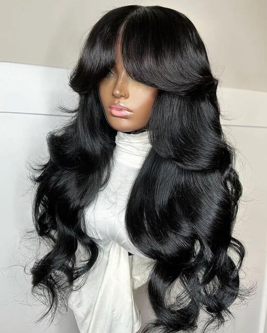 eullair New Pre Cut Lace Closure Layered Cut Body Wave Wig Blow Out Wavy With Air Bangs Human Hair Wigs For Women