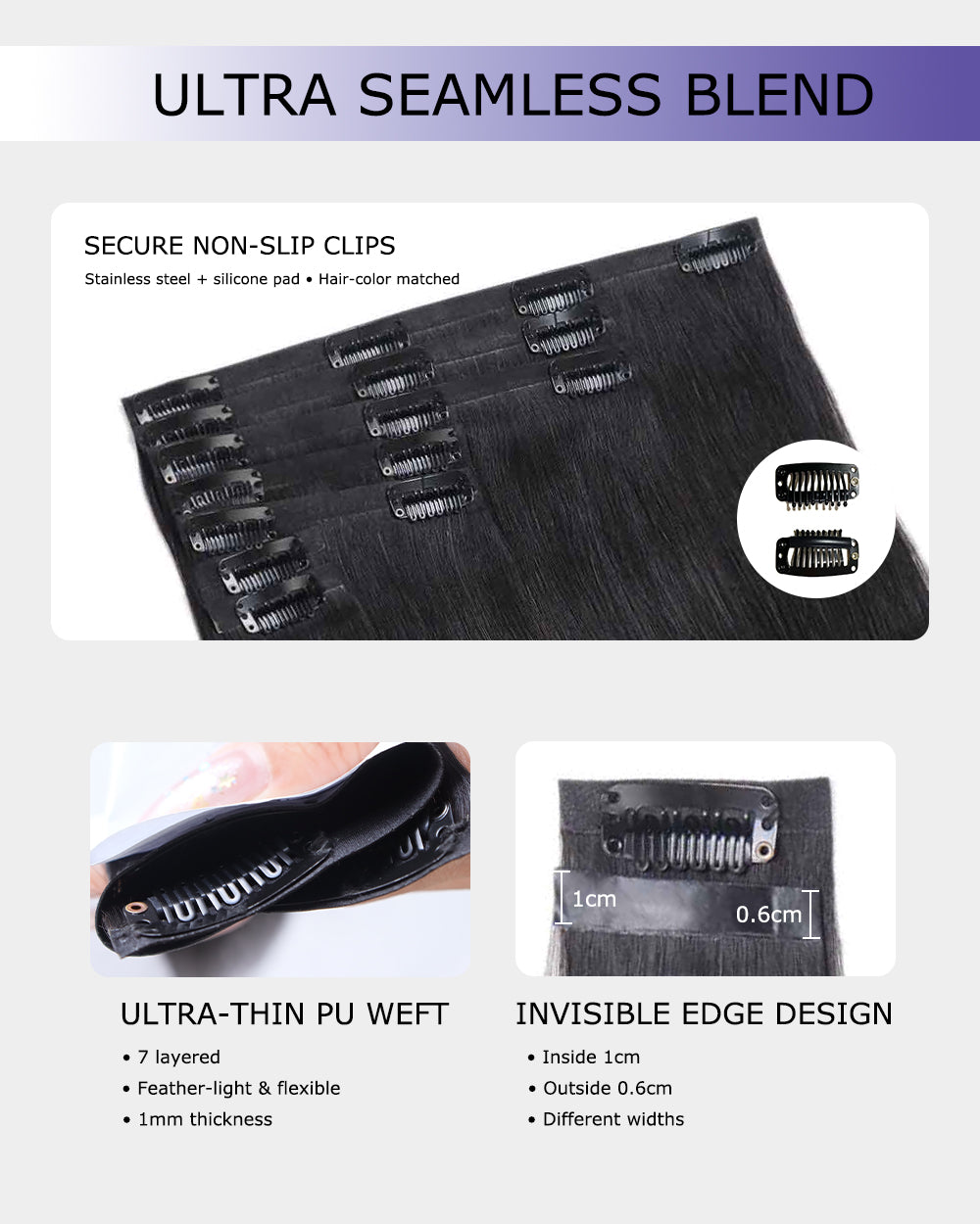 • Seamless Invisibility: The ultra-thin PU skin weft is significantly slimmer than standard clip-ins, making it invisible even in fine hair.