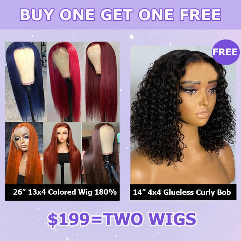 Flash Sale $199=2 Human Hair Wigs| Buy 26inch Colored Straight 13x4 Lace Wig Get a 14inch Curly Glueless 4x4 Bob Wig For Free