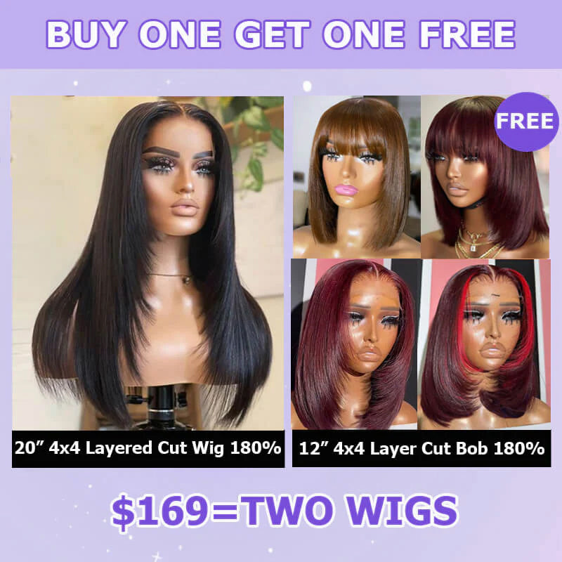 Flash Sale $169=2 Human Hair Wigs| Buy Layered Cut Straight 4x4 Lace Wig Get a Colored Straight 4x4 Bob Wig For Free