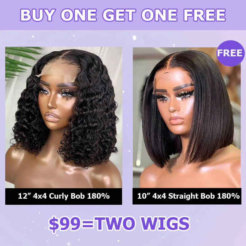 Flash Sale $99=2 Human Hair BOB Wigs| Buy 4x4 Lace Closure Curly Bob Wig Get a Straight 4x4 Bob Wig for Free