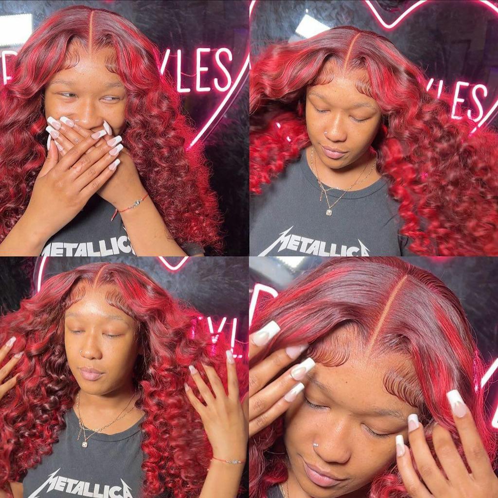 eullair Wine Red Highlight Crimped Wavy Wig With Curling Iron Burgundy Skunk Stripe Human Hair Lace Frontal Wig