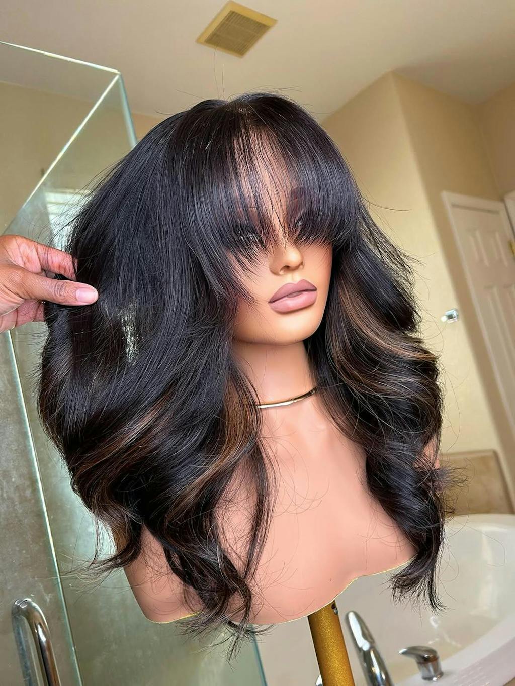 eullair Butterfly Curls With Bangs 13x4 Black Mixed Brown Highlight Lace Frontal Human Hair Wigs 250% Density